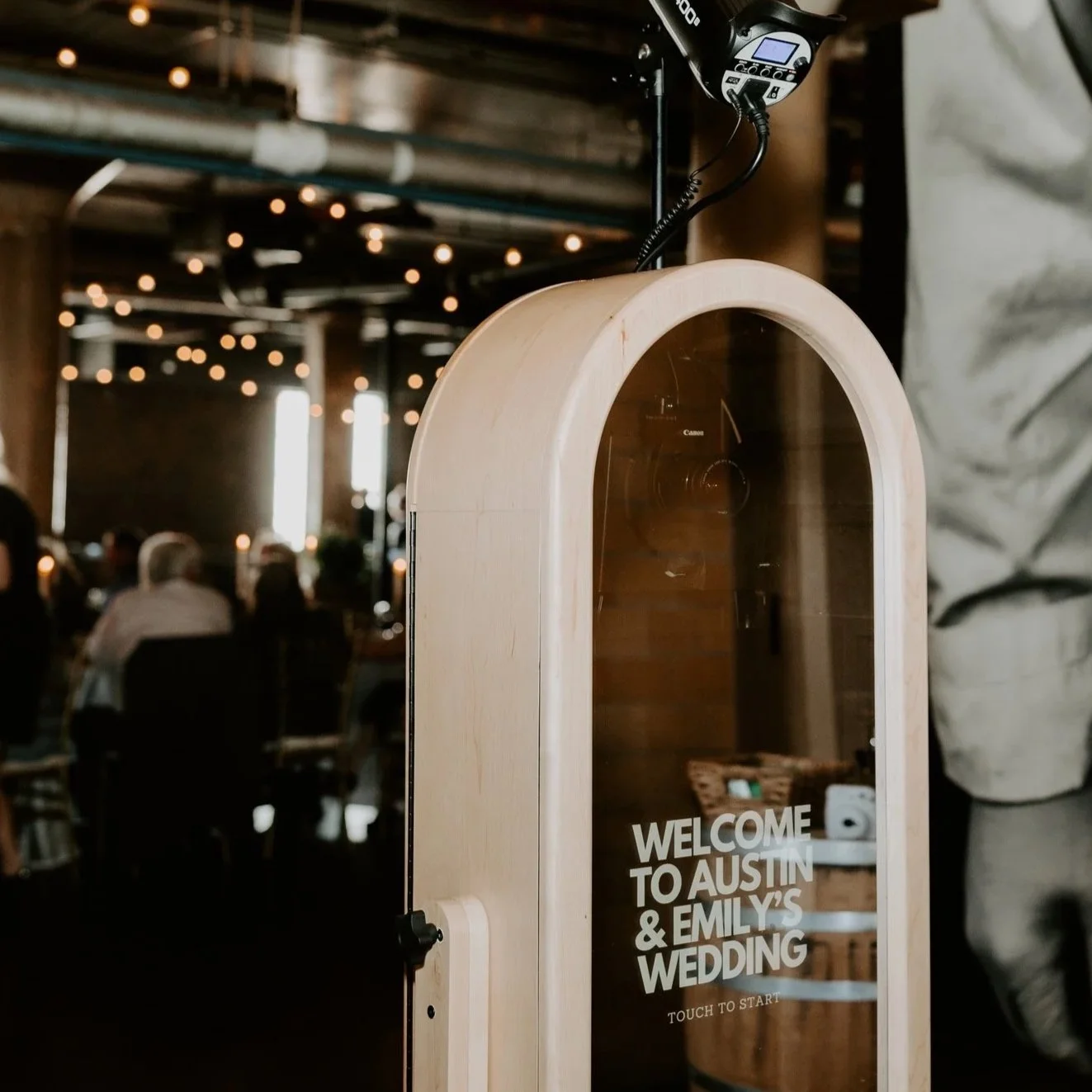 A distinctive DSLR photo booth designed as a full-length, wood-framed mirror—where modern design meets rustic charm.